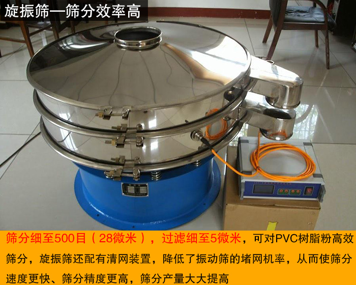 旋振篩可以篩分過濾顆粒,細(xì)粉,漿液的物料,既可粗略分級,又可精細(xì)篩分或者過濾,篩分效率高,根據(jù)實際生產(chǎn)需要可單層或多層使用,全封閉結(jié)構(gòu),無粉塵溢散,篩網(wǎng)不阻塞、粉末不飛揚(yáng)、篩分細(xì)至500目(28微米),過濾細(xì)至5微米,可對PVC樹脂粉高效篩分,旋振篩還配有清網(wǎng)裝置,降低了振動篩的堵網(wǎng)機(jī)率,從而使篩分速度更快、篩分精度更高,篩分產(chǎn)量大大提高。