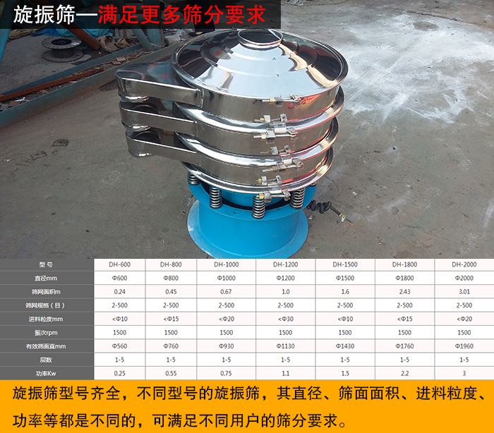 旋振篩型號從DH-600、DH-800、DH-1000、DH-1200、DH-1500、DH-1800、DH-2000,不同型號的旋振篩,其直徑、篩面面積、進(jìn)料粒度、功率等都是不同的,可滿足不同用戶的篩分要求。