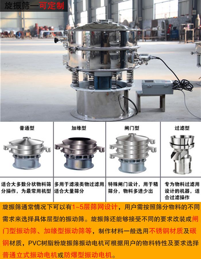 通常情況下,旋振篩通常情況下可以有1~5層篩網(wǎng)設(shè)計,用戶需按照篩分物料的不同需求來選擇具體層型的振動篩。旋振篩還能夠接受不同的要求改裝成閘門型振動篩、加緣型振動篩等,制作材料一般選用不銹鋼材質(zhì)及碳鋼材質(zhì),PVC樹脂粉旋振篩振動電機(jī)可根據(jù)用戶的物料特性及要求選擇普通立式振動電機(jī)或防爆型振動電機(jī)。