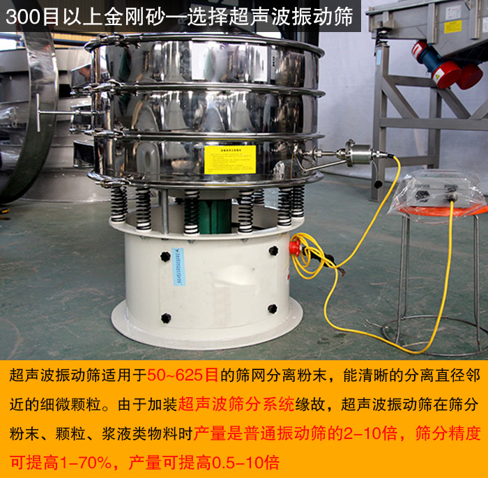 對于300目以上特別細的金剛砂微粉來說,可以選擇超聲波振動篩。
